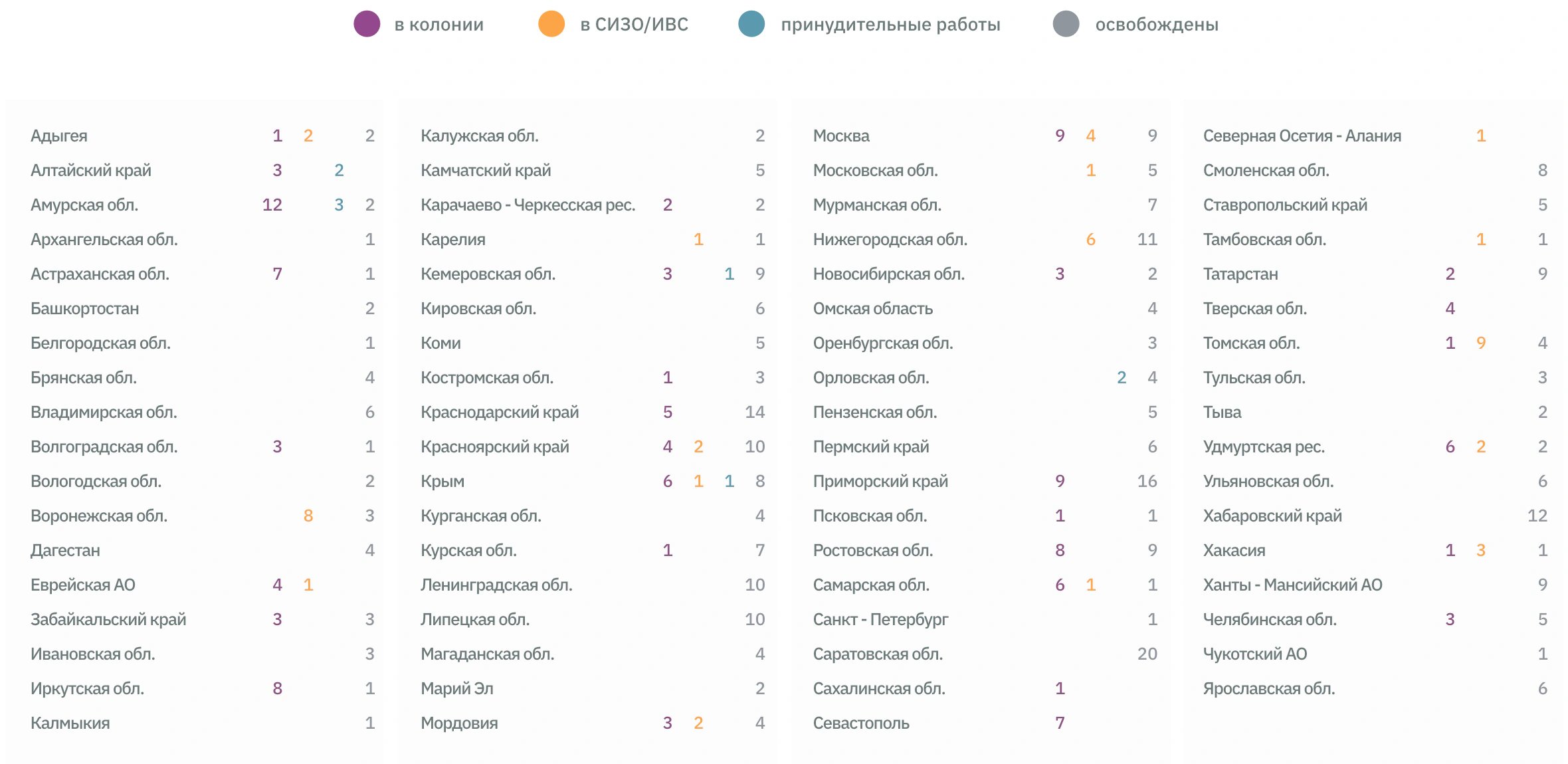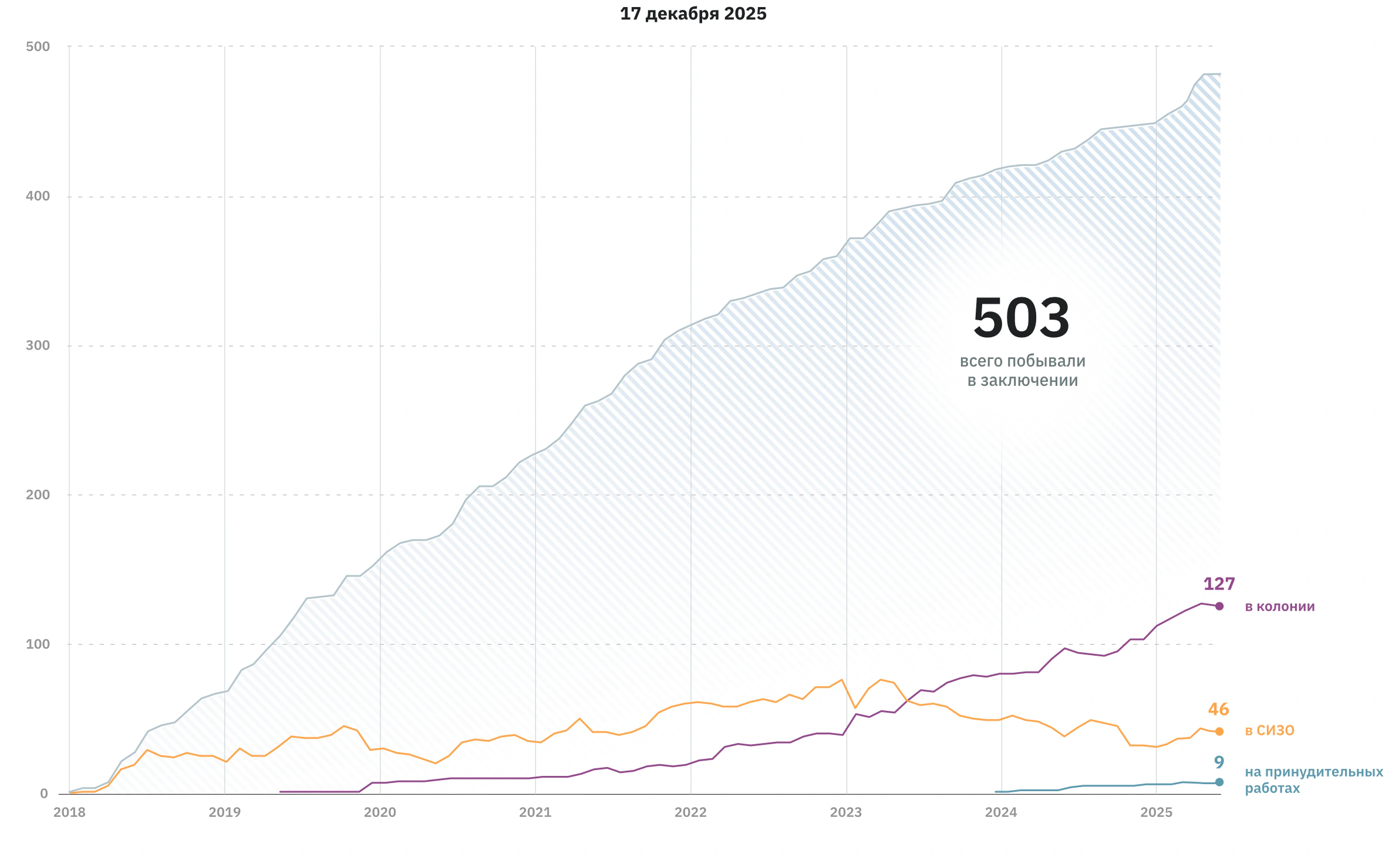 Суды продолжают отправлять Свидетелей Иеговы за решетку, а приговор троим из них обновил рекорд по жесткости. Были случаи насилия и пыток, среди «узников совести» выросла доля пожилых, есть лица с тяжелой формой инвалидности, один из них умер вскоре после приговора; сохраняется тенденция преследования целыми семьями.