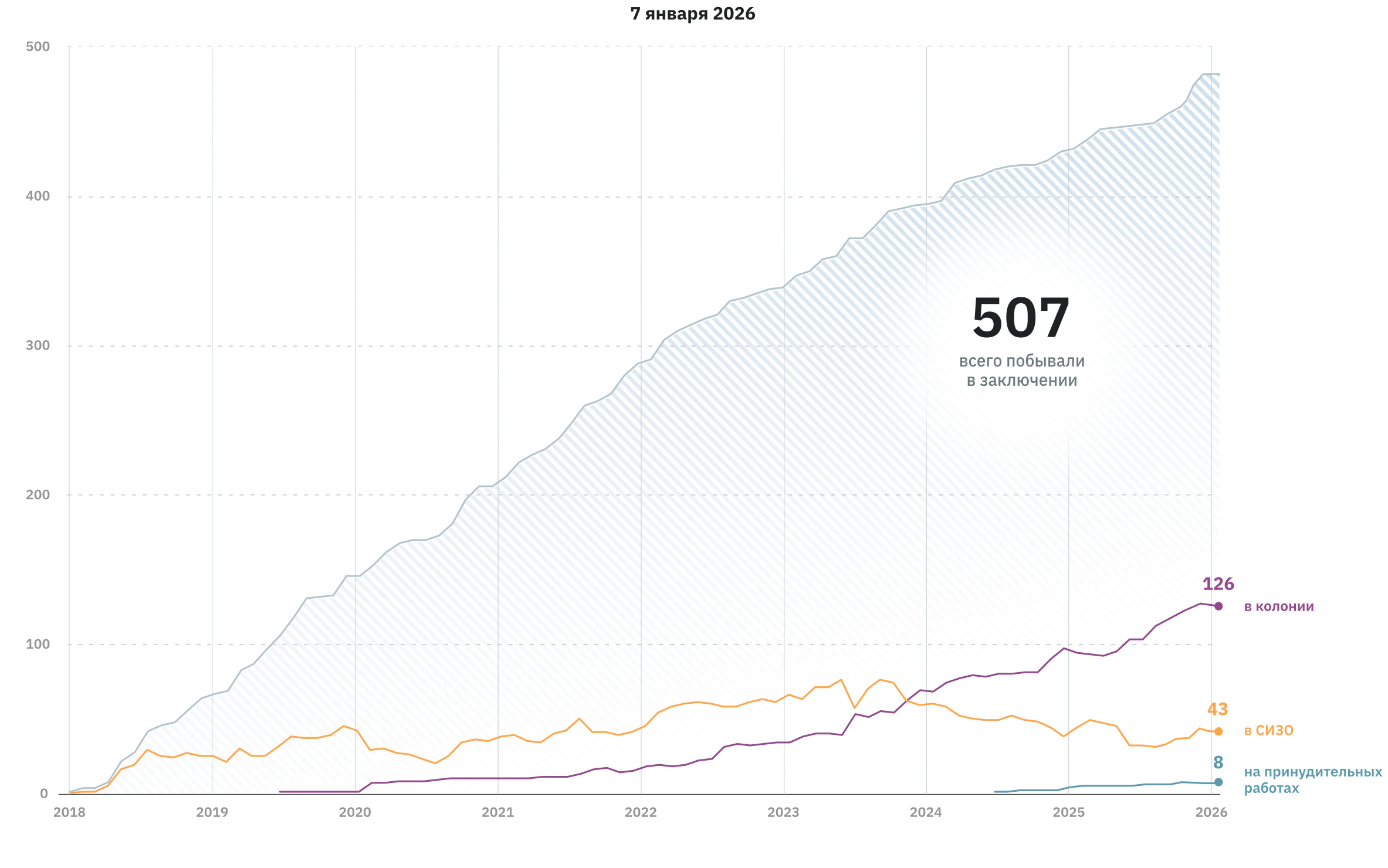 Очередная волна борьбы правоохранителей с запрещенной в России и признанной экстремистской организацией «Свидетели Иеговы» прокатилась по разным регионам. 10 февраля Абинский районный суд Краснодарского края приговорил к 7,5 годам колонии 63-летнего Александра Ившина. Столь длительный срок он получил за то, что посредством видеосвязи обсуждал со знакомыми Библию и учение иеговистов, а также исполнял религиозные песнопения. В эти же дни задержаны и обвинены в участии в экстремистской деятельности верующие в Москве, Биробиджане, Кызыле. Всего с 2017 года, когда организация была признана экстремистской и запрещена на территории РФ, преследованиям, в том числе уголовным, по данным правозащитников, подверглось более 220 человек.