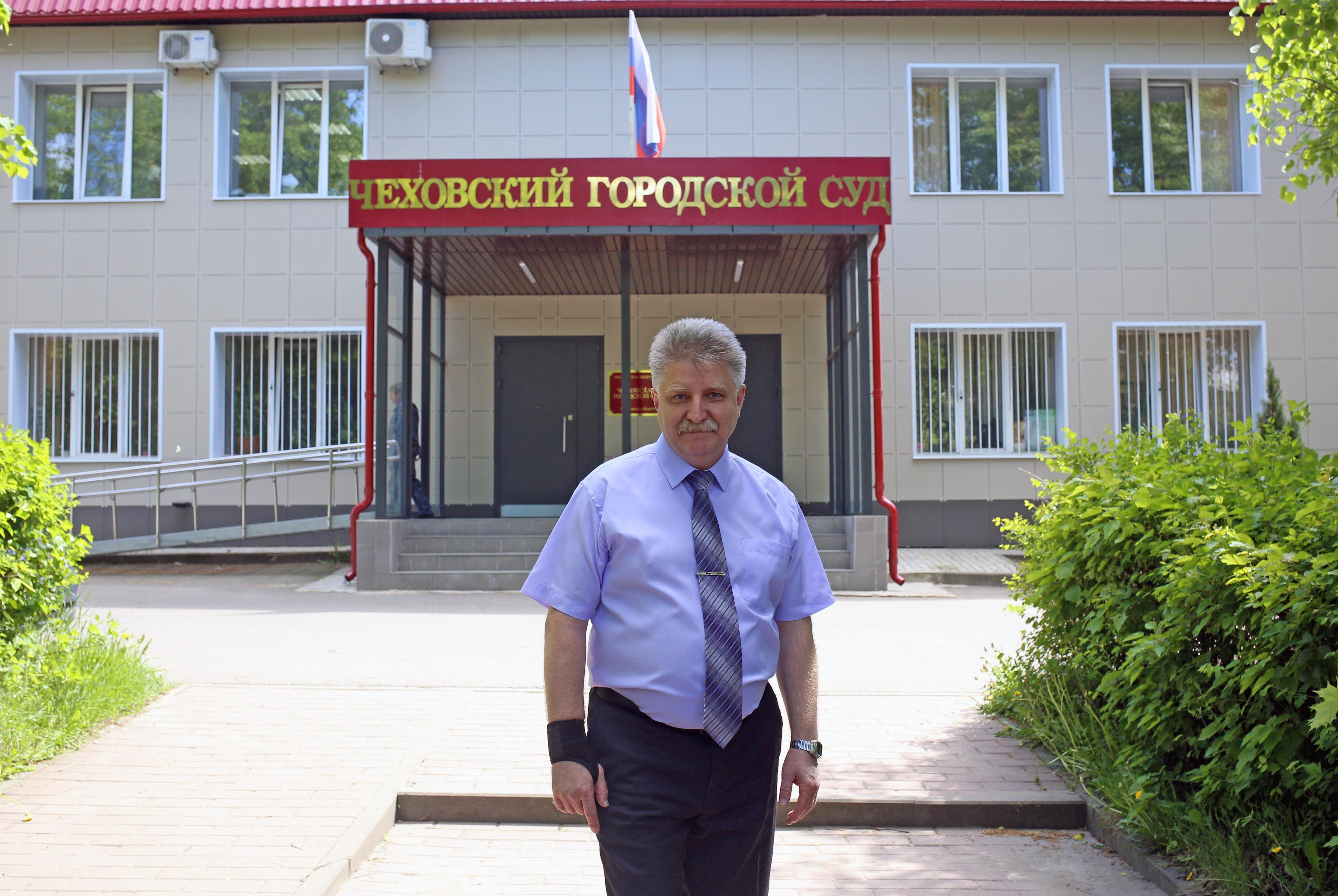 Фото: Виталий Никифоров, Юрий Крутяков и Константин Жеребцов у здания Чеховского городского суда, май 2021 года