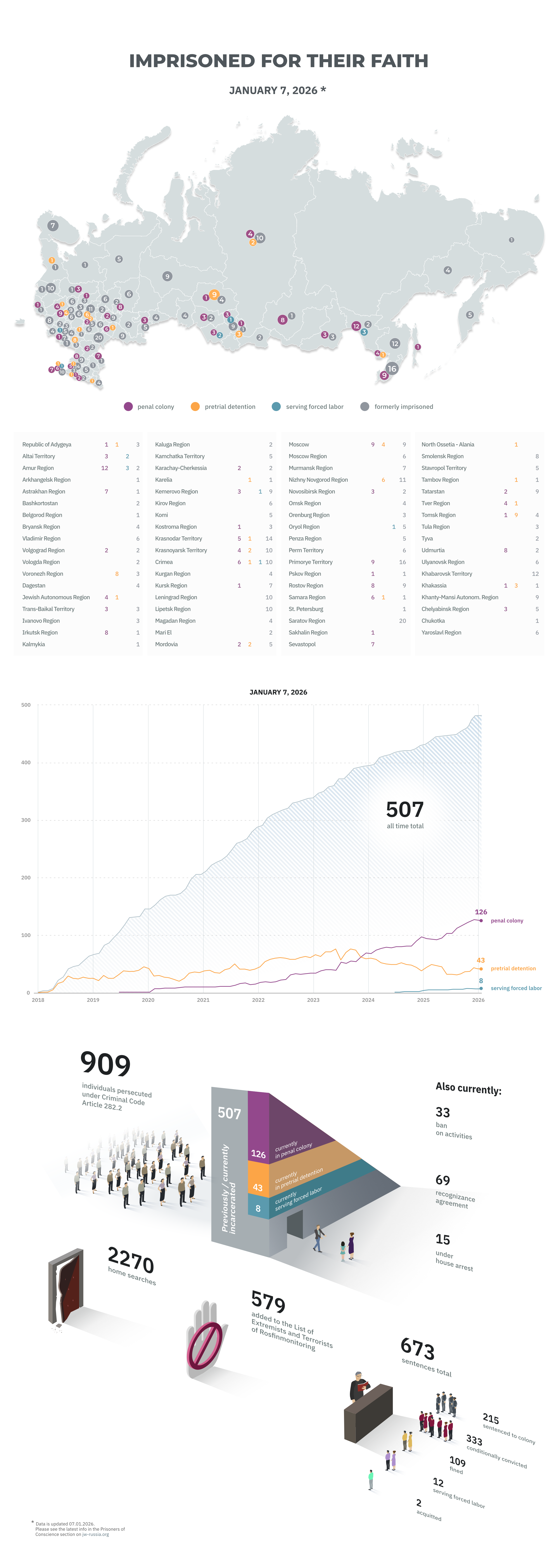 法院继续将耶和华见证人送进监狱,其中三人的刑期创下了新的严厉纪录。有暴力和酷刑案件,老年人在“良心犯”中的比例有所增加,有严重残疾的人,其中一人在判决后不久就去世了;起诉整个家庭的趋势仍在继续。