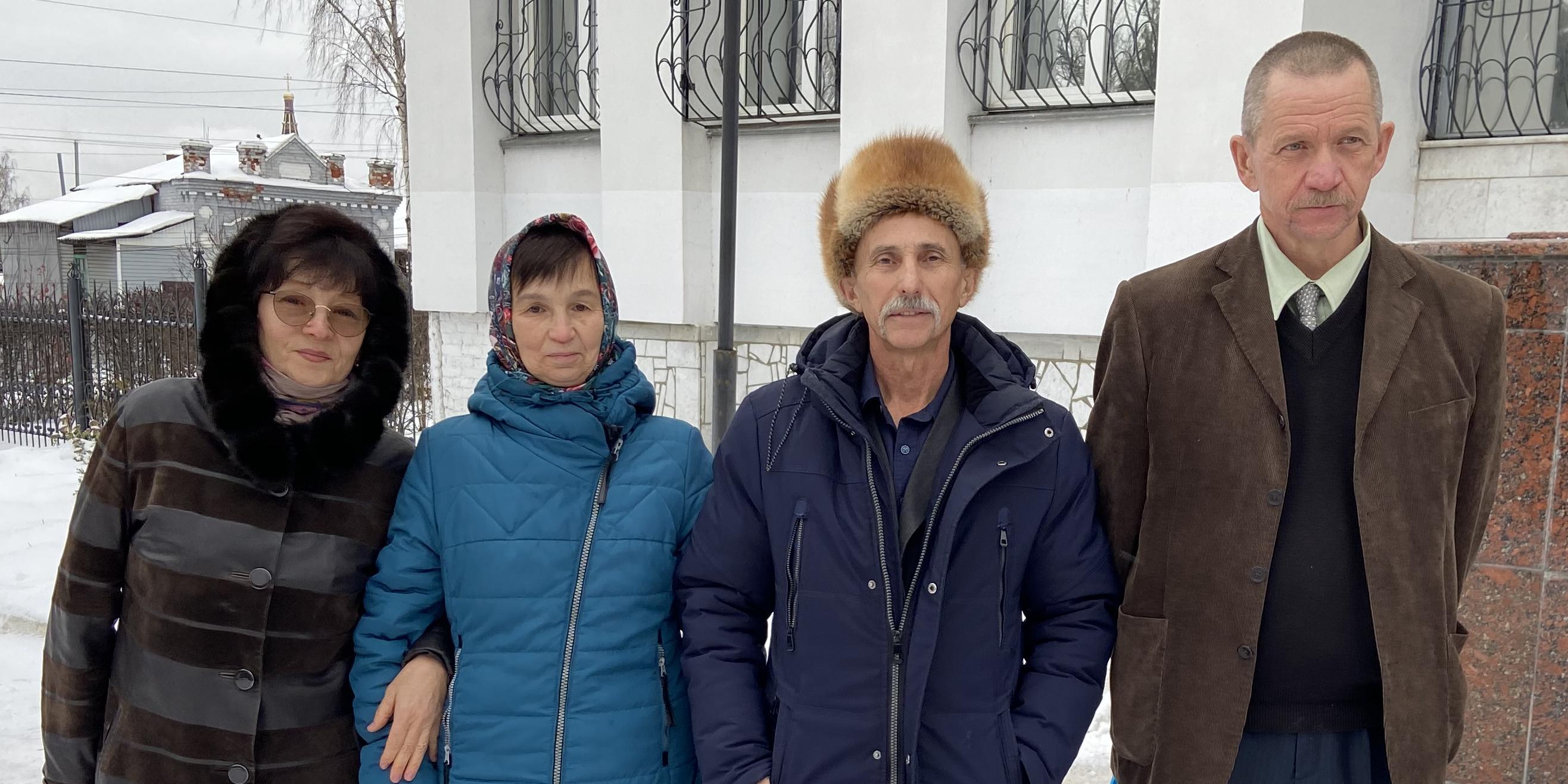Martynova Nina, Pavlova Zoya, Yermakov Mikhail und Martynov Andrey im Gerichtsgebäude. Dezember 2022