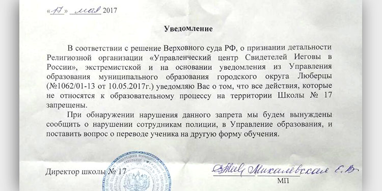 Moscow RegionOn May 17, 2017, E. Mikhalevskaya, the director of the school in the village of Tomilino (Moscow region), in the presence of the school psychologist and the head of security, officially handed over to the parents of an 8-year-old student a document in which, with reference to the decision of the Supreme Court against Jehovah's Witnesses, she notified of the ban on "all actions that are not related to the educational process" on the school grounds. "If we find a violation of this prohibition," warns the director, " we will be forced to report the violation to the police, to the Department of Education, and raise the issue of transferring the student to another form of education." In response to questions from parents, the director made it clear that she knew about the religion of the family. The girl sang songs of Jehovah's Witnesses, and also talked about God with a classmate.
