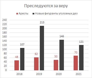 How many people were repressed for their faith in 2021? As of December 31, 2021, 597 followers of the religion of Jehovah's Witnesses are officially in the status of accused, suspected, indicted, convicted, or acquitted. Of these, 142 learned about the criminal prosecution in 2021. (In 2019, this figure was 213, and in 2020 - 146.) The total number of criminal cases reached 277 (most often 2 or more defendants in one criminal case).