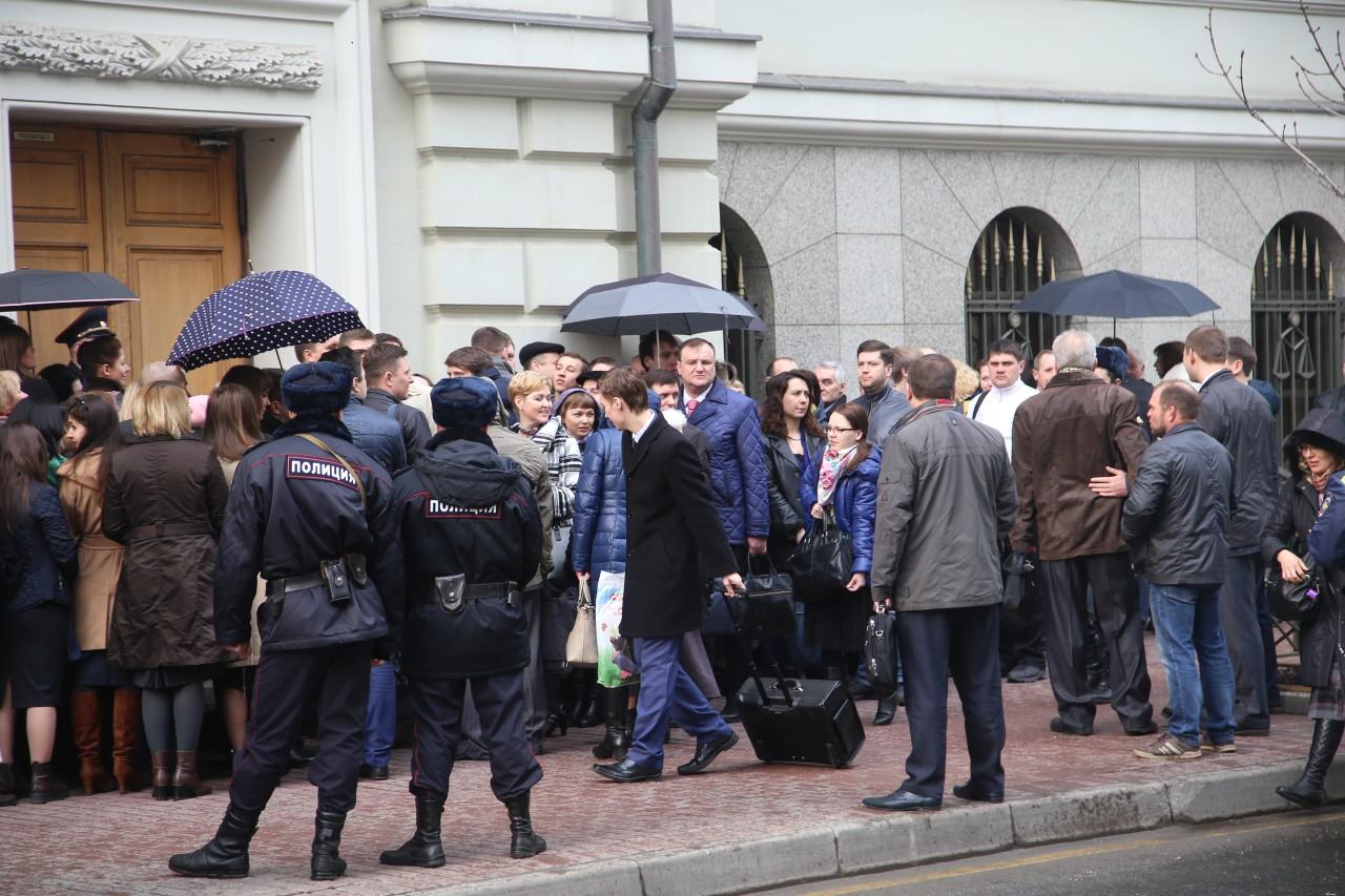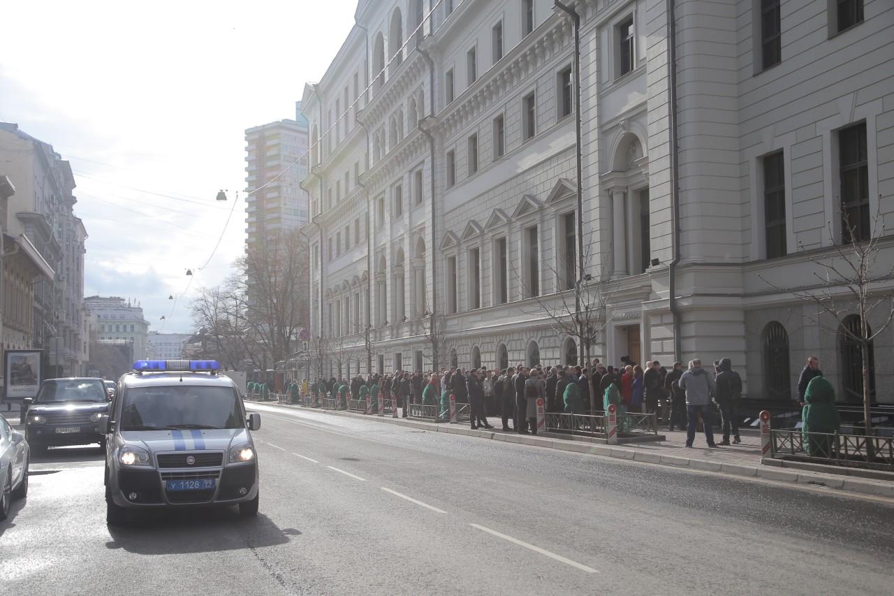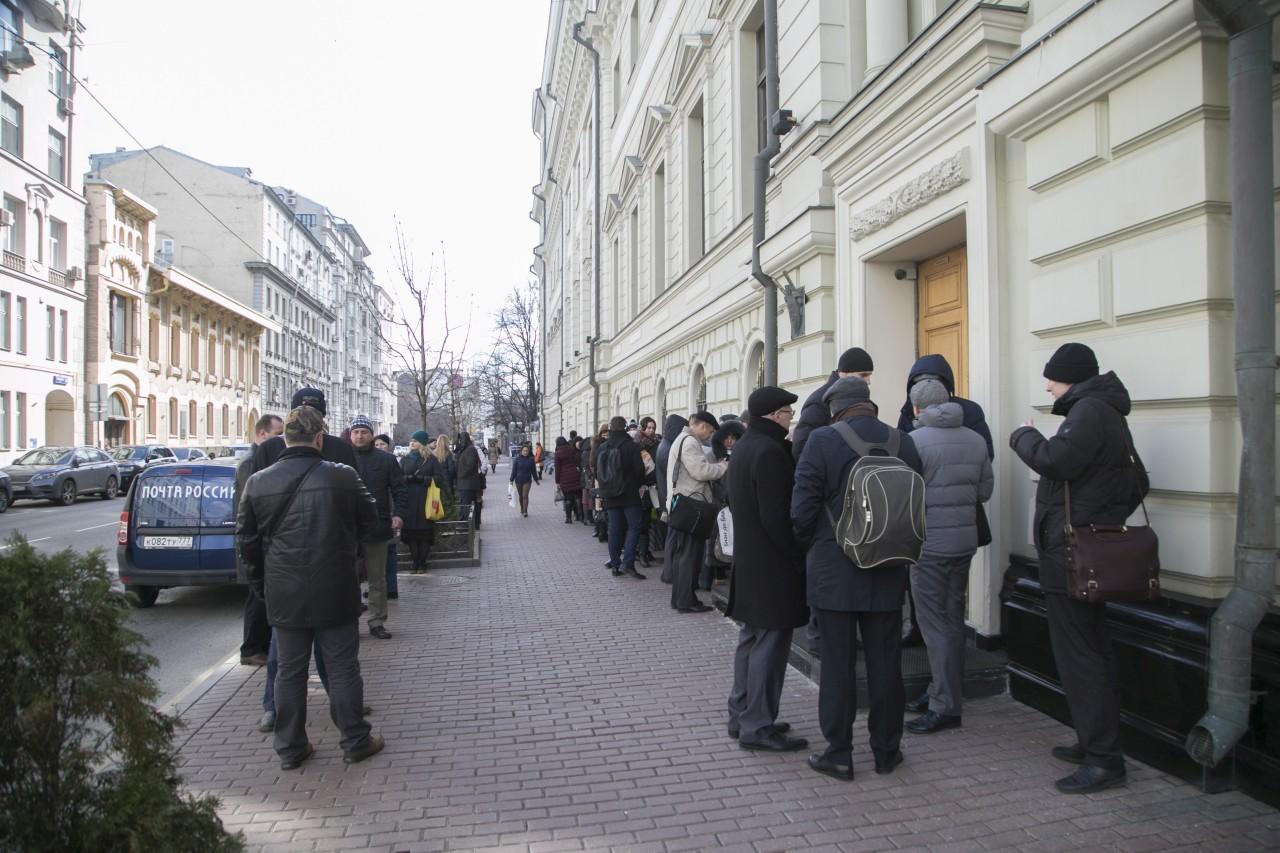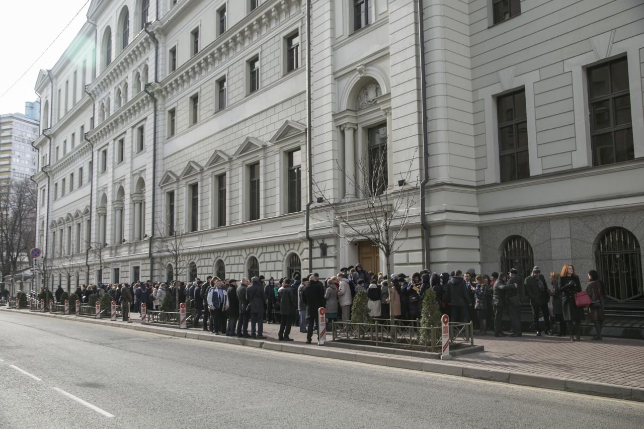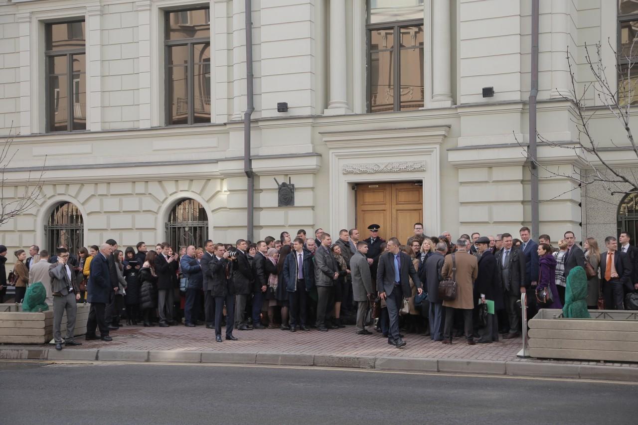 | 9:00 | A frente do prédio da Suprema Corte está mais lotada do que nunca. A fila começou a se formar à noite. Muito especialmente veio de diferentes cidades da Rússia. Como o clima em Moscou é frio, a maioria está vestida no inverno. De vez em quando, alguém trazia café e tortas para os que estavam na fila. Pessoal A polícia trabalha de forma profissional e coerente, garantindo a segurança dos envolvidos no julgamento. |